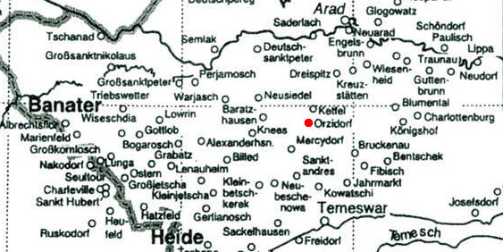 Orzydorf, today is situated in Timis, Romania, its geographical coordinates are lat. 45° 57′ 49″ North, long. 21° 11′ 54″ East and its original name (with diacritics) is Orţişoara. See below, the aerial photograph of Ortisoara in Romania.